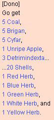 | 03. Talk to Dono in the lower left part of Lighthalzen. (Rotate camera angle around, he's hard to see in default view.) He will ask you to bring 5 Coal (Golem) 5 Brigan (Greatest General, Raydric) 5 Cyfar (Orc Lady, Wild Rose) 1 Unripe Apple (Poring) 3 Detrimindextra (Hydra, Remover) 20 Shell (Chonchon, Horn) 1 Red Herb (Red Plant) 1 Blue Herb (Blue Plant, Spore) 1 Green Herb (Green Plant, Poporing) 1 White Herb (White Plant) 1 Yellow Herb (Yellow Plant) to him. |