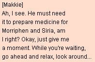 | 06. Bring the medicine to Morriphen. He'll hurry you to bring the medicine to Siria. | |